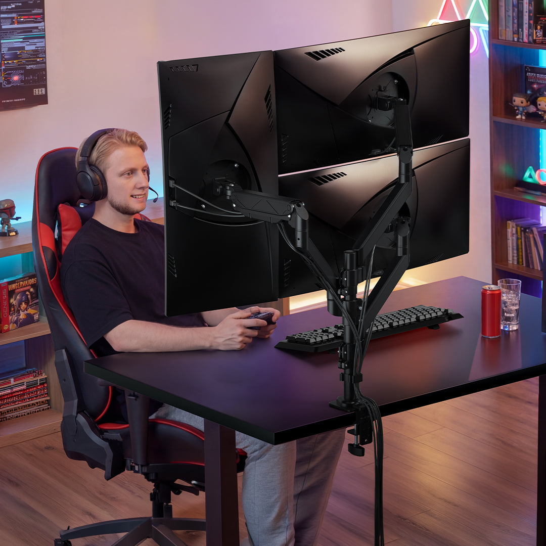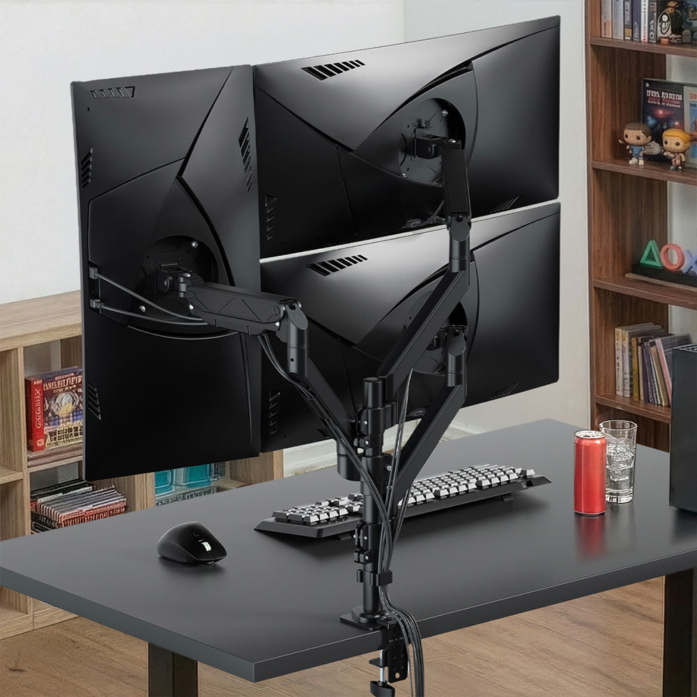 FORT三螢幕組合支援金字塔三角排列,依任務需求自由切換配置。懸臂設計釋放桌面空間,打造整潔、寬敞且高效的工作環境。